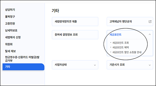 들어가서 기타를 클릭하면 저렇게 세금포인트 조회 및 혜택 등을 알아볼 수 있어요