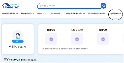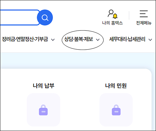 국세청 홈텍스로 들어가서 로그인을 한 후 상단 오른쪽 상담, 불복, 제보를 클릭합니다