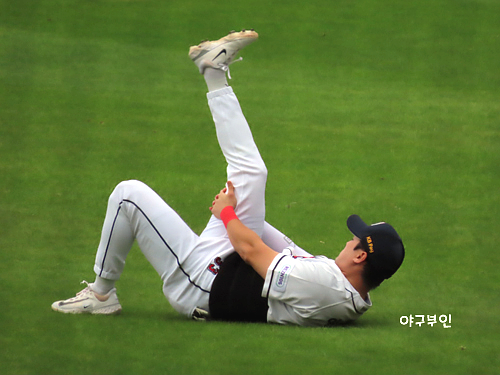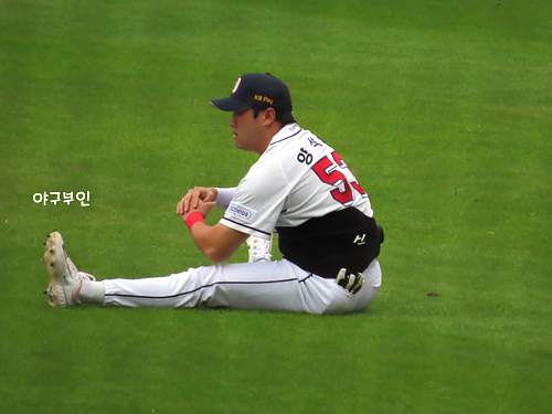 주심이 공을 맞아 잠시 경기가 멈춘 상황..열심히 몸을 푸는 김재호 선수