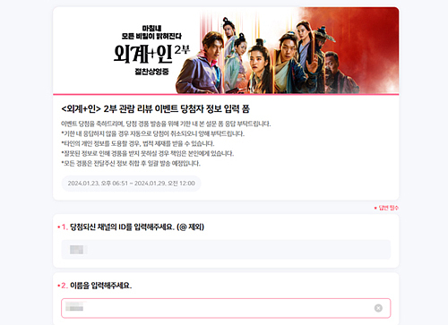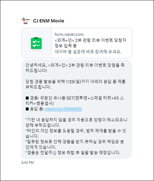 아, 제가 영화 '외계+인 2부' 영화리뷰 이벤트에 응모를 해봤는데요..이런 쪽지가