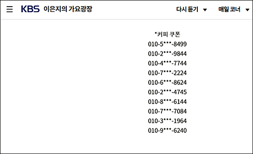 해당되는 시청자가 메시지를 보내고 그 중 뽑아서 커피쿠폰을 보내주는 코너인데