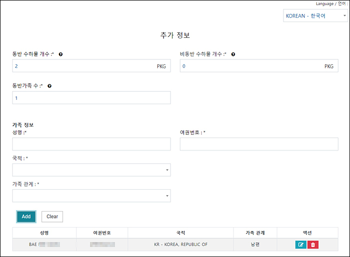 가족당 하나만 필요하구요 동반가족은 인원수대로 추가하면 됩니다..물론 저는 남편을 추가했습니다..ㅎㅎ