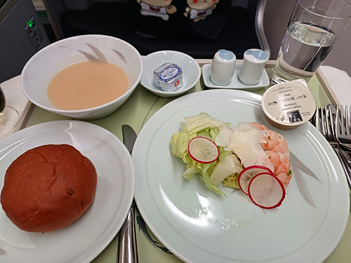 새우가 들어간 샐러드와 빵 그리고 스프