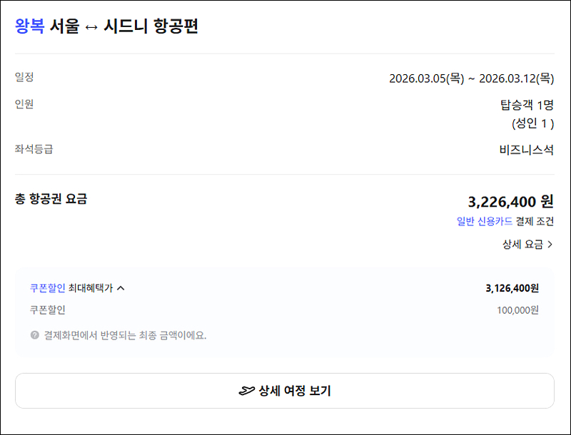 홈피보다 24만원 저렴한 (프레스티지석) 3,126,400원에 결제했습니다..1만원의 발권 수수료를