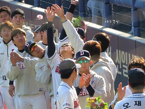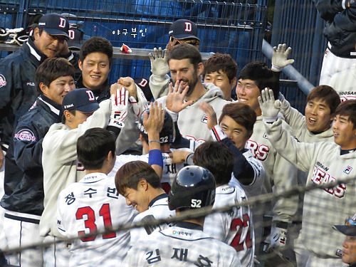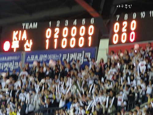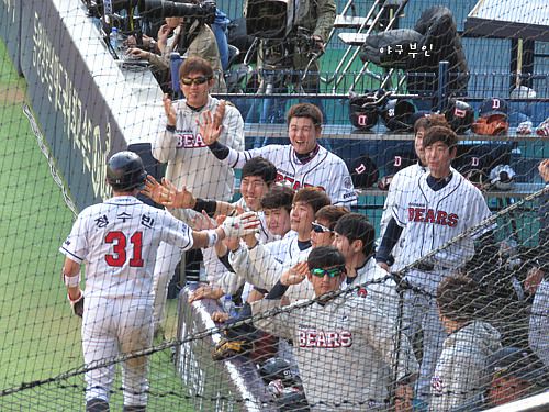 9회 말, 김현수 선수의 희생플라이로 동점을 만들어낸 베어스