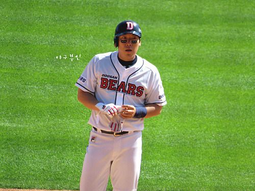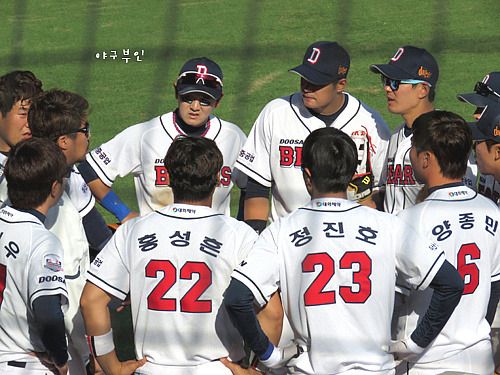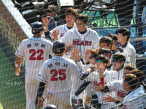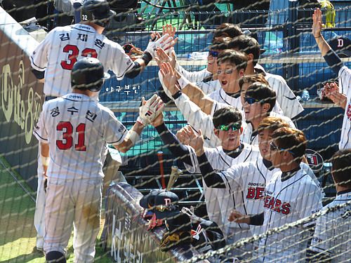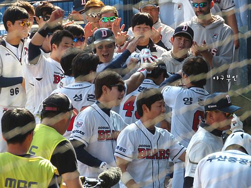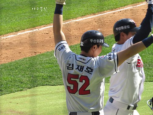 김재호 선수의 2루타로 홈을 밟은 선수들