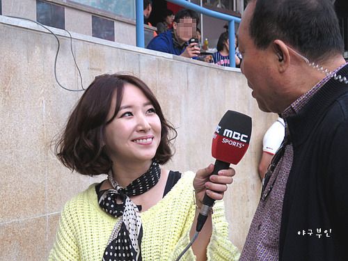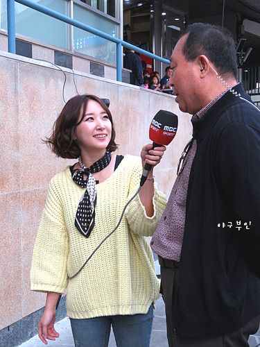 클리닝 타임 때 인터뷰를 하고 있는 김인식 감독님과 김선신 아나운서