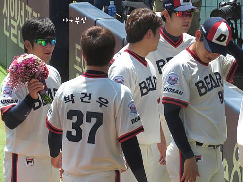 4월 월간 MVP로 뽑힌 김재호 선수와 유희관 선수..유희관 선수는 선발이라 나오지 않았네요