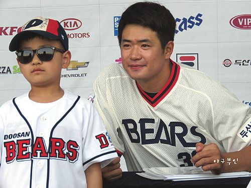 빙그레 웃는 김재환 선수 옆에 긴장한 어린이..??