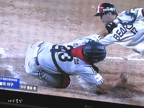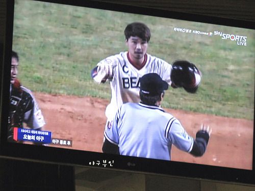 석 점을 뽑아낸 후, 협살에 걸린 김현수..이후 홈으로 뛰어든 오재원 선수..합의판정 요청