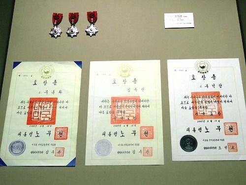 대통령 노무현이라는 이름이 제일 먼저 눈에 띄네요..해녀에게 수여된 상장과 훈장입니다