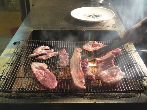 초벌구이를 해서 테이블 불판에 올라온 제주산 돼지고기 모둠..가격은 800g에 6만원입니다