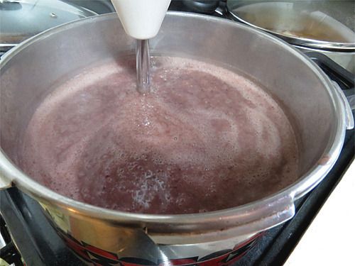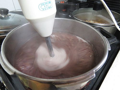 한소큼 끓은 팥과 찹쌀을 도깨비 방망이로 윙~~ 잘 갈아줍니다..핕이나 밥알이 씹히는 것을