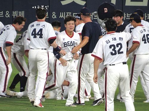김재환 선수의 동점 적시타로 홈을 밟고 덕아웃에 들어온 류지혁 선수