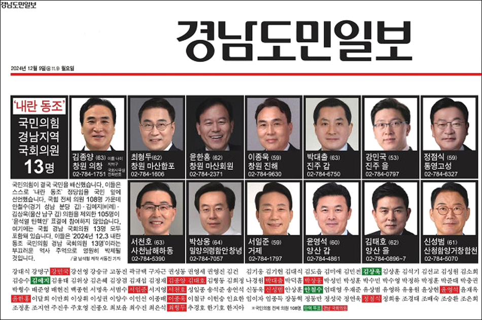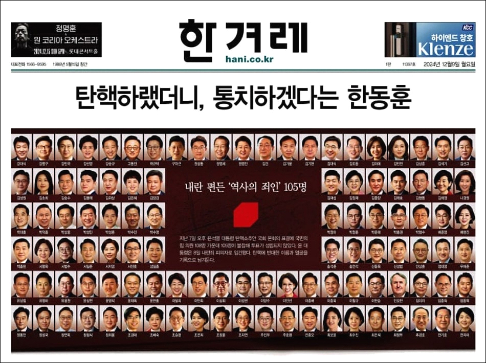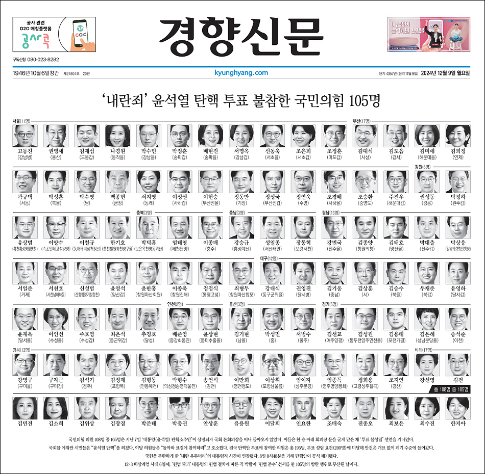 '내란 죄' 윤석열 탄핵 투표 불참한 '역사의 죄인' 국민의 힘 의원 105명 박제