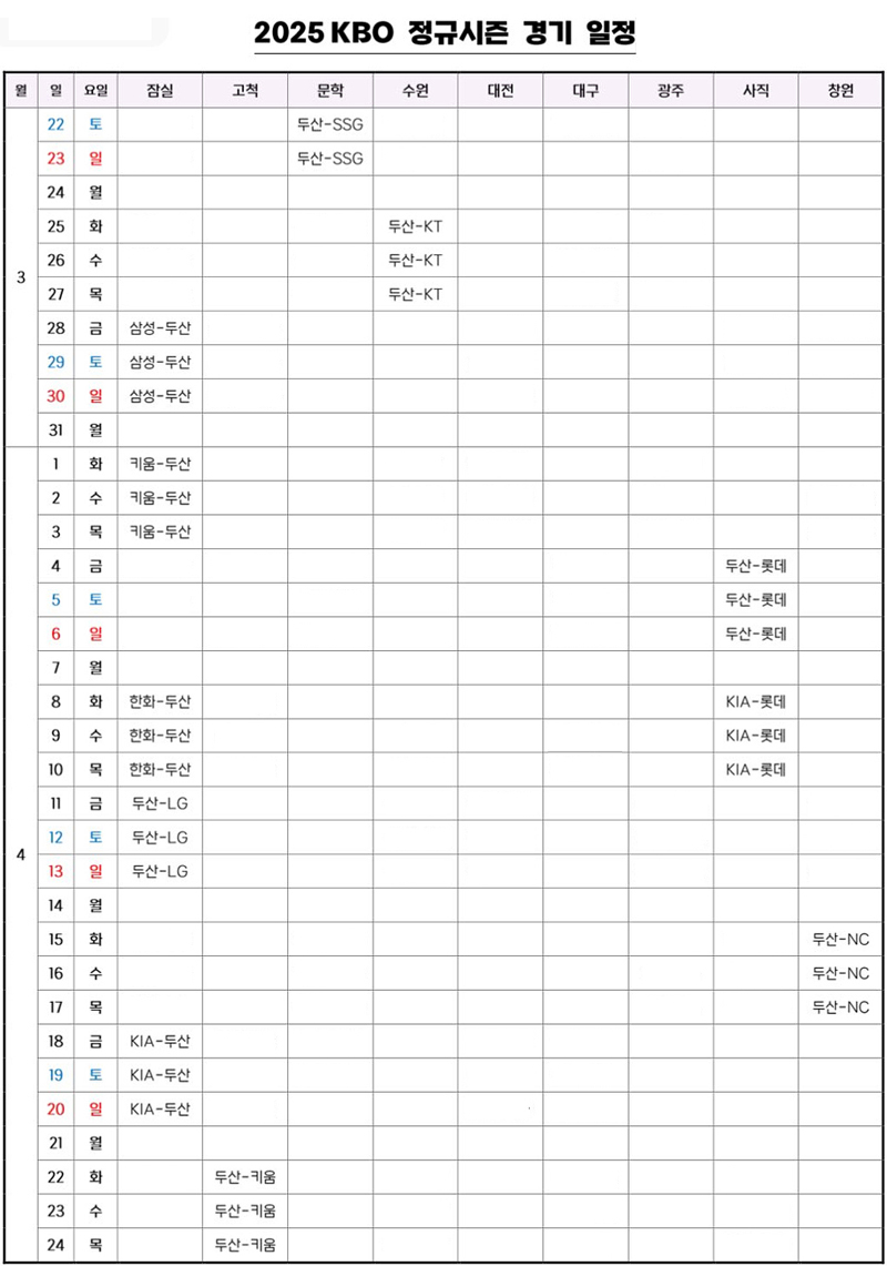 2025 프로야구가 92일 앞으로 다가왔구요..망할 베어스는 무려 2년 연속 원정경기로 시즌 시작을 하게 됩니다..ㅠㅠ