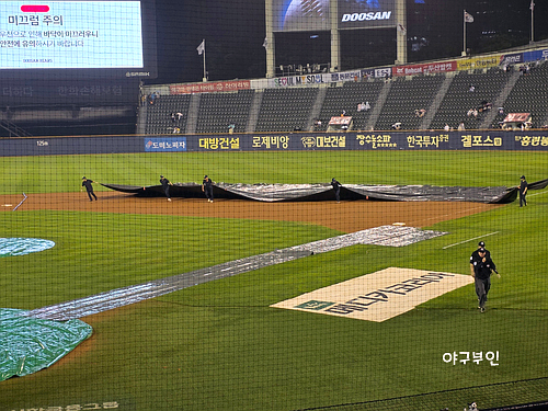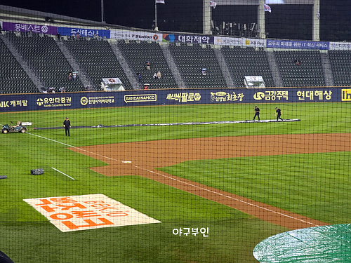 좀 그치는 듯 하니 심판이 방수포를 걷어내자고 했는데..결국 다시 덮는 중..-.-