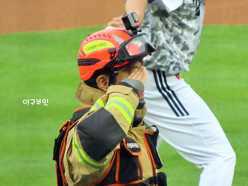 오늘 시구는 지난 3월 영님지역 산불현장에서 진화작업을 했던 손용원 소방대원입니다