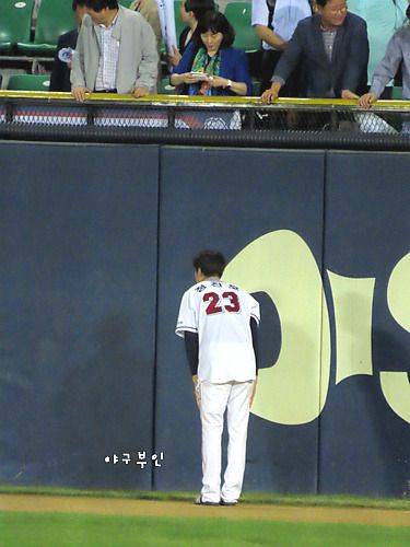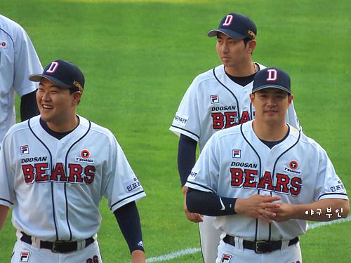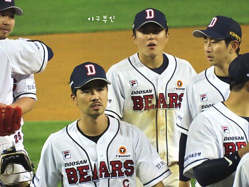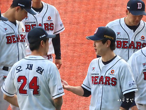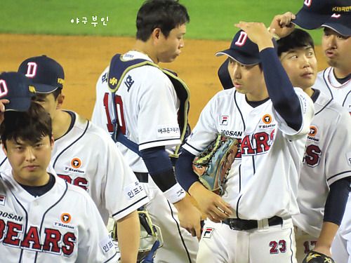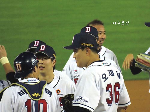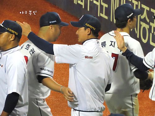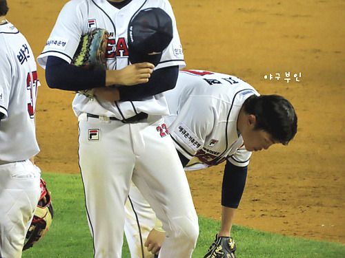 외야에서 연신 인사를..ㅋ 완투승을 거둔 유희관 선수도 중앙대 출신