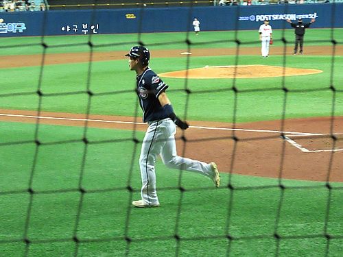 김재환 선수의 안타로 홈에 들어오는 대주자 조수행 선수