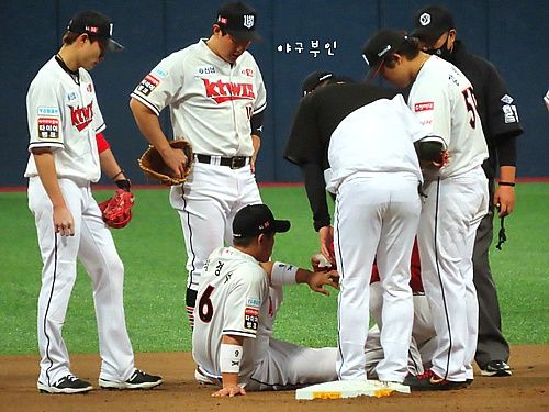 태그 과정에서 박경수 선수의 손가락에 약간의 부상이 발생한 듯