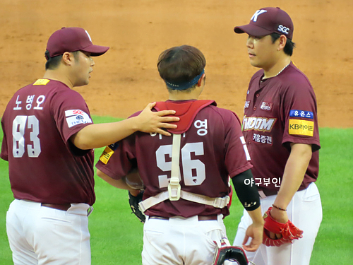 승리투수 요건인 아웃카운트 하나 남겨놓고 신중하게 대처하는 배터리