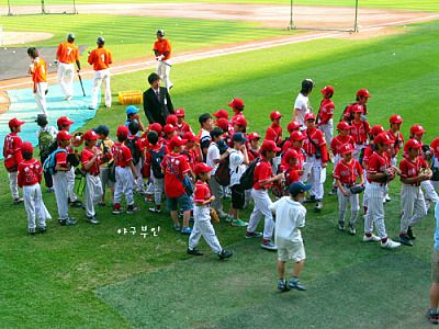 경기 전, 야구를 하는 어린이들이 그라운드 방문을 했습니다