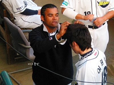 이원석 선수가 자기 머리에 관심을 보이자 이원석 선수의 머리를 만지네요