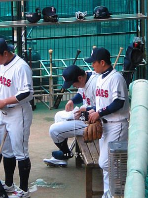 경기 전, 신발끈을 잘 묶고있는 김현수 선수