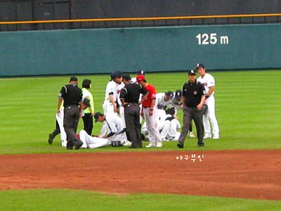 잠시 후 손시헌 선수는 일어났으나 고영민 선수는