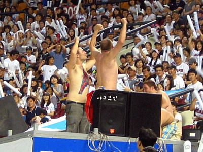다섯 명의 외국인이 배에 BEARS를 새기고 응원단상에 올랐습니다