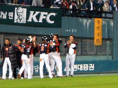동점타를 만든 이성열 선수를 맞이하는 선수들의 표정