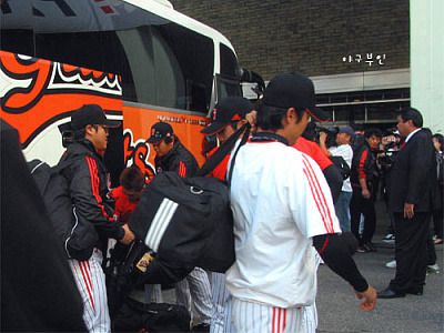 롯데 선수단 버스가 야구장에 도착했습니다