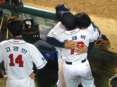 장원진 코치와 부둥켜안고 있는 김현수 선수