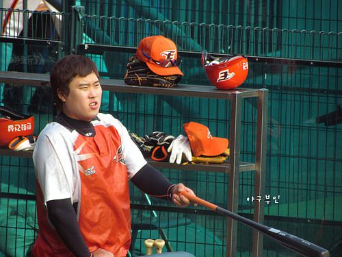 경기 전, 추승우 선수와 얘기를 나누고 있는 정재훈 투수..두 사람은 성균관대를 같이 다녔죠