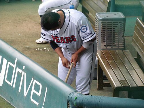 경기 전에 신중하게 배트를 점검하는 두목곰