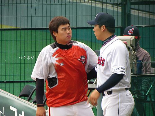 김현수 선수에게 대형사인볼을 선물로 받은 류현진 투수