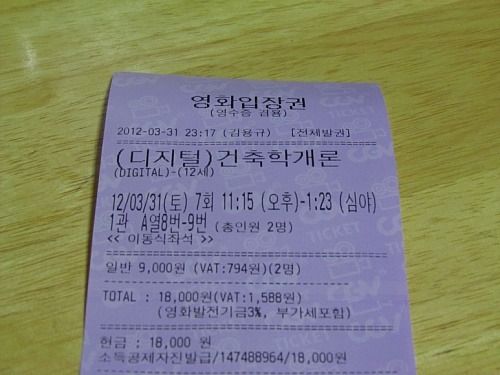 3월 31일 밤에 세 번째로 '건축학개론'을 관람하고 왔습니다..^^ 저희집 근처에 사는 지인이
