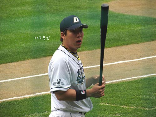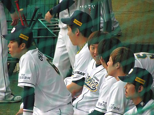 니퍼트 투수에게 몸에 맞는 볼을 맞아서..무척 아팠다는 모션을 취하는 중입니다..ㅋㅋ