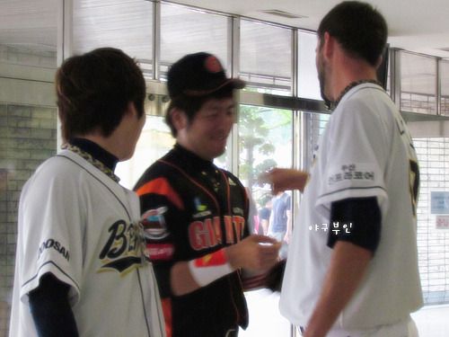 사인회를 마치고 들어오는 니퍼트 투수를 발견한 강민호 선수..26일, 토요일 경기에서