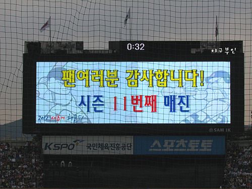 전광판에 열 한 번째 매진에 일곱 경기 연속매진이라 감사하다는 글귀..아, 이거 정말