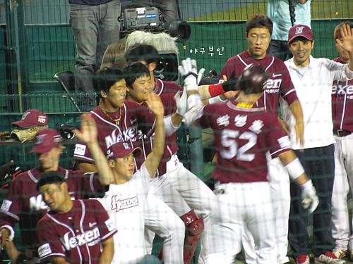 고영민 선수의 적시타로 홈에 들어오는 김동주 선수