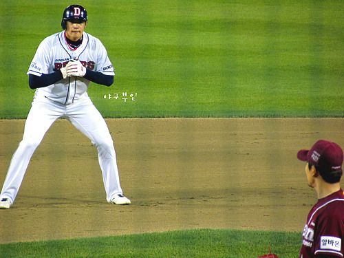 6회 말, 2루타를 치고 나간 김재환 선수..그러나 점수 못 냄..-.-