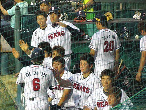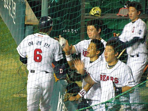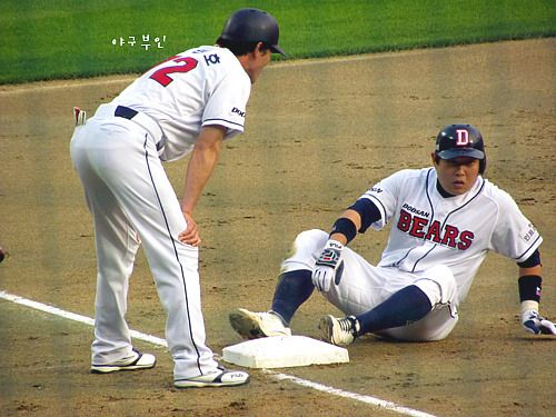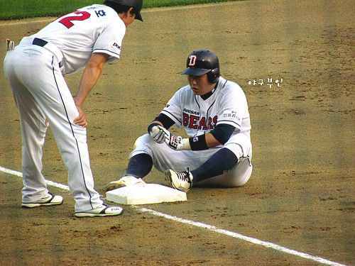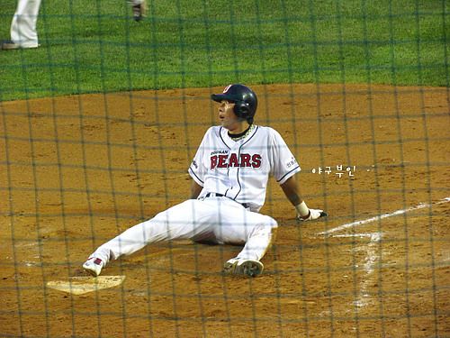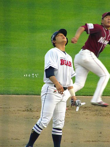 헉~!! 양의지 선수의 안타로 3루를 지나 홈으로 들어오려다 돌아온 두목곰..허벅지 통증..ㅠㅠ