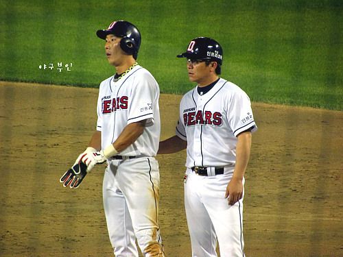 김동주 선수가 협살에 걸린 사이 3루로 들어오다 역시 아웃돼버린 양의지 선수