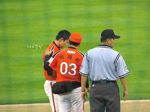 김선우 투수가 1루로 던진 공에 그만 머리쪽을 맞은 정범모 선수