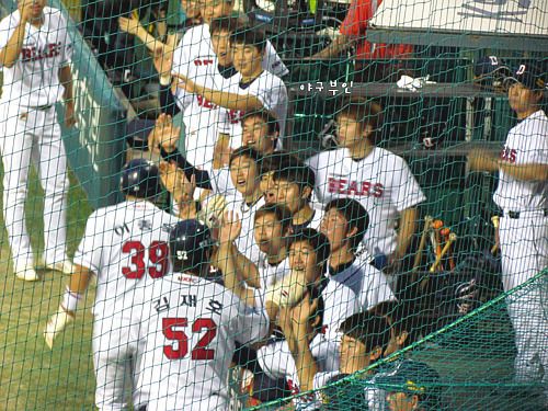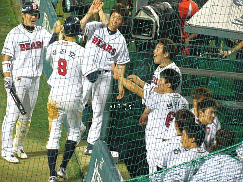 두 점을 실점했으나 바로 석 점으로 뒤집어놓는 베어스 선수들