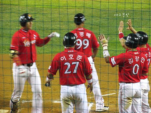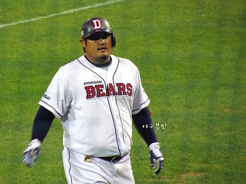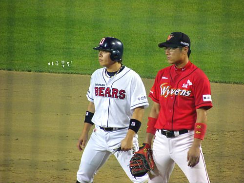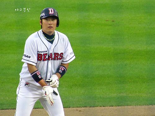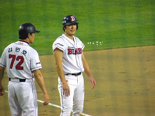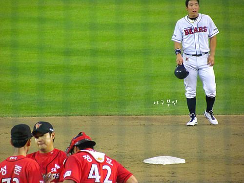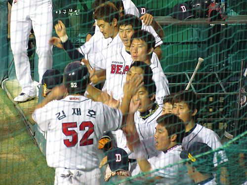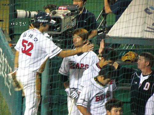 윤석민 선수의 안타로 홈을 밟은 재호재호..베어스 선취점 획득