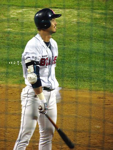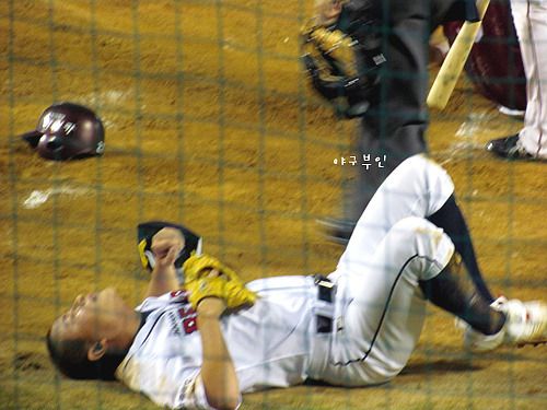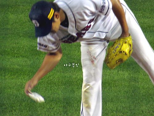 잘 던지던 노경은 투수가..수비로 오른쪽 팔 뒷부분에 찰과상을 입었고..김현수 선수의