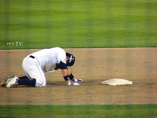 선행주자였던 이종욱 선수, 홈으로 들어올 수 있었는데 그걸 그만 3루 코치가 막아버린..-.-
